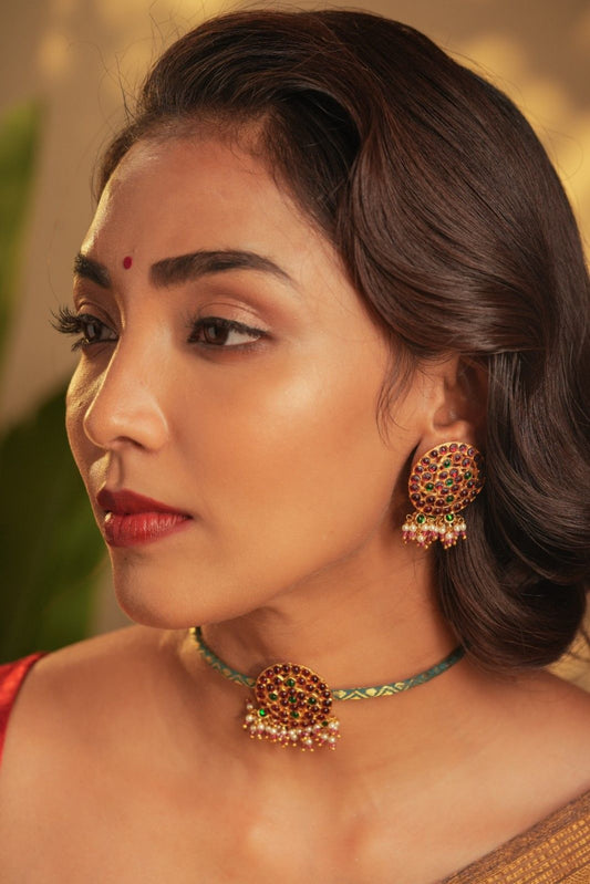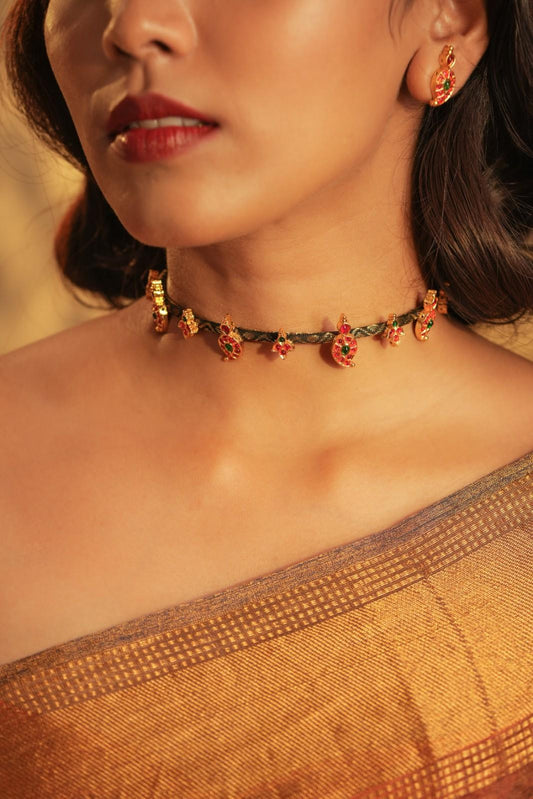 Modern Choker Necklace with Temple Motif and Brocade - Blue