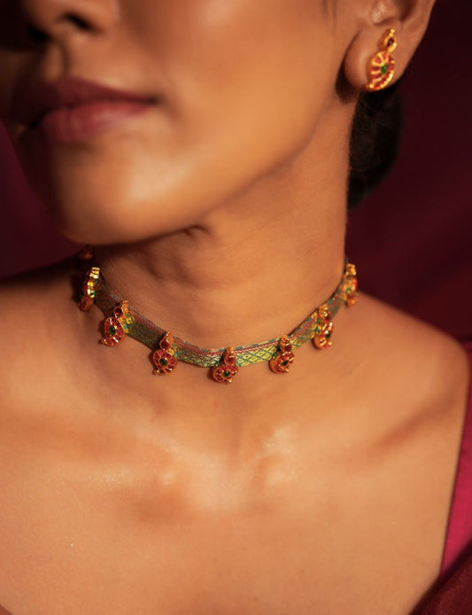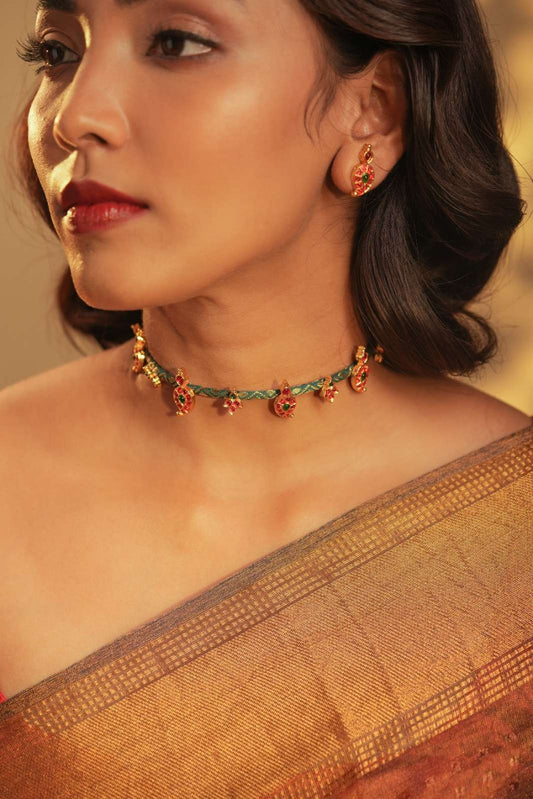 Choker Necklace for Saree with Temple Motif and Brocade - Yellow