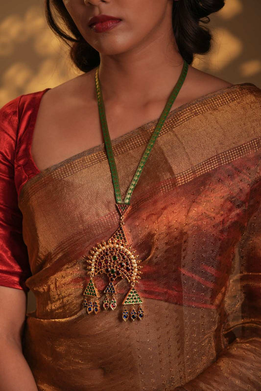 Temple Motif Long Necklace Set with Green Brocade and 5 Pendants