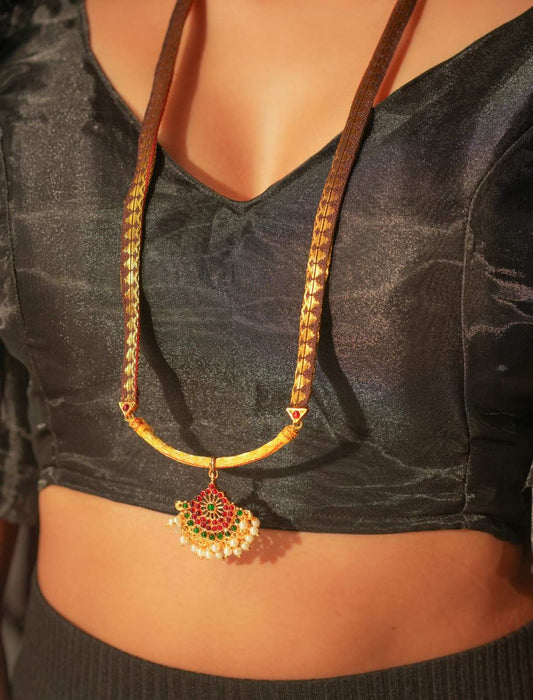 Long Statement Necklace with Moon Motifs and Zari Temple Design