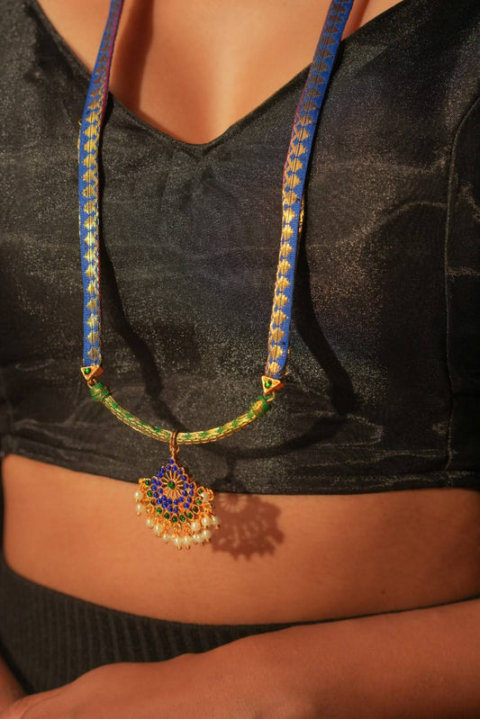 Long Pearl Necklaces - Temple Motif with 5 Pendants and Blue Strings