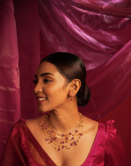 Layered Chain Necklace with Temple Manga Motif in Pink