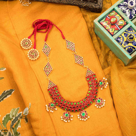 Peal Neck Piece with Soot Black, Wine Red Stones & Peacock Motif