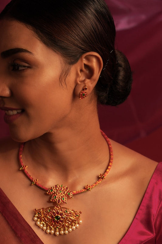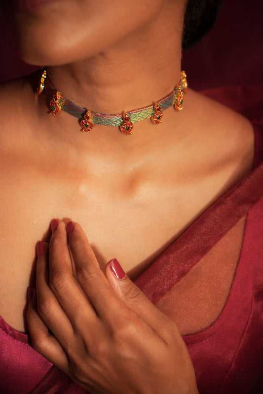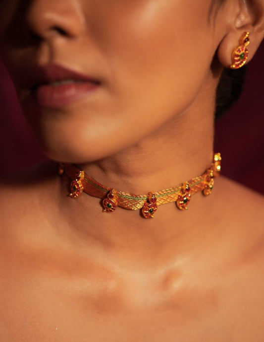 Choker Necklace for Saree with Temple Motif and Brocade - Yellow