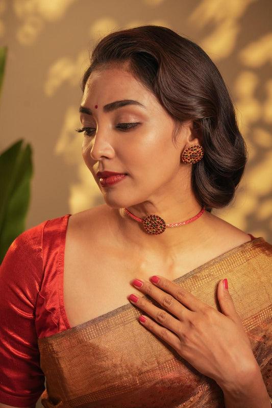 Women's Statement Necklace with Moon Motifs and Green Zari