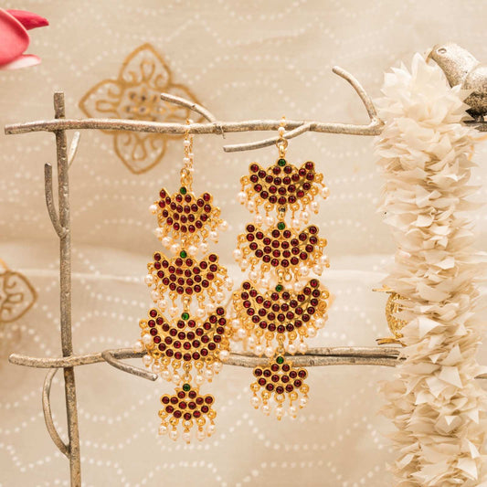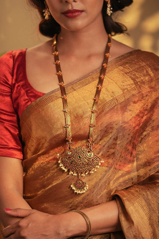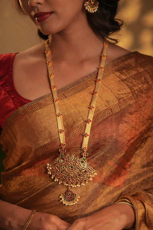 Temple Jewellery Necklace Set with Brown Brocade and 5 Pendants