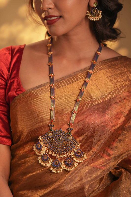 Temple Long Necklace with Blue Brocade and 5 Pendants