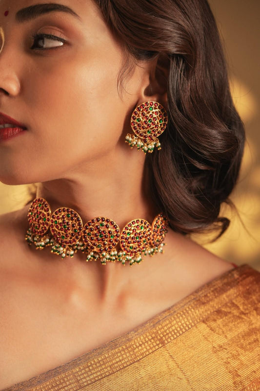 Temple Motif Long Necklace Set with Green Brocade and 5 Pendants