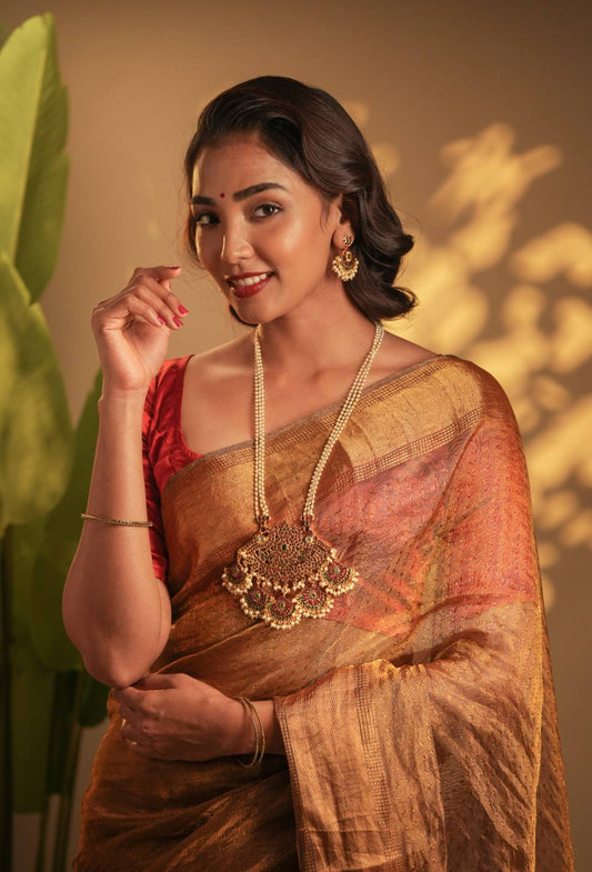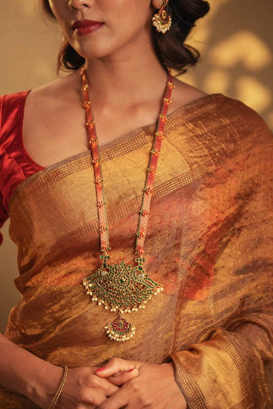 Temple Motif Long Necklaces for Women with Orange Brocade
