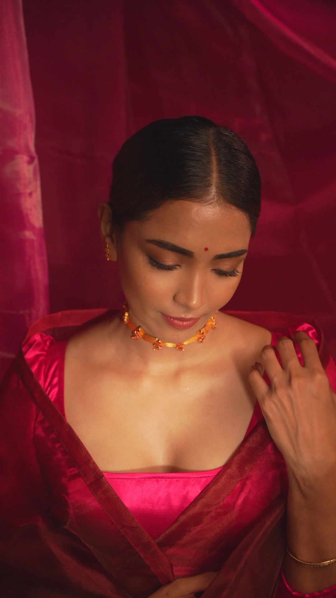 This chocker necklace for saree blends Banarsi brocade/zari fabric with traditional temple motifs, creating a timeless piece. The luxurious shimmer of the zari thread makes it perfect for special occasions, cultural celebrations, and festivals.