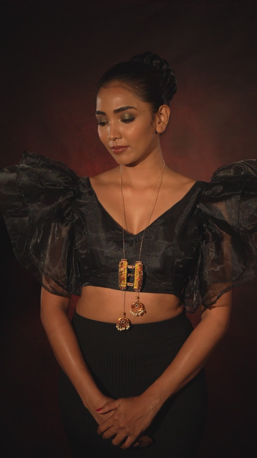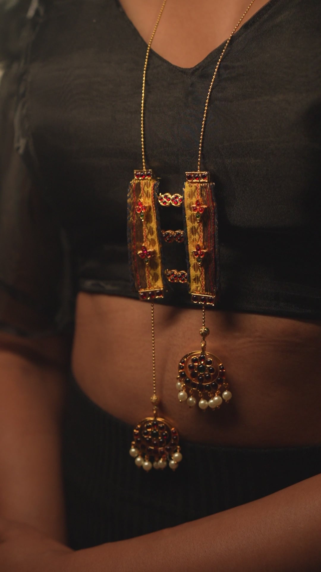 This necklace temple design combines brocade fabric with traditional temple motifs, creating a simple yet statement-making piece. Perfect for both Indian and western ensembles, it elevates your style effortlessly. Each handcrafted piece may vary slightly