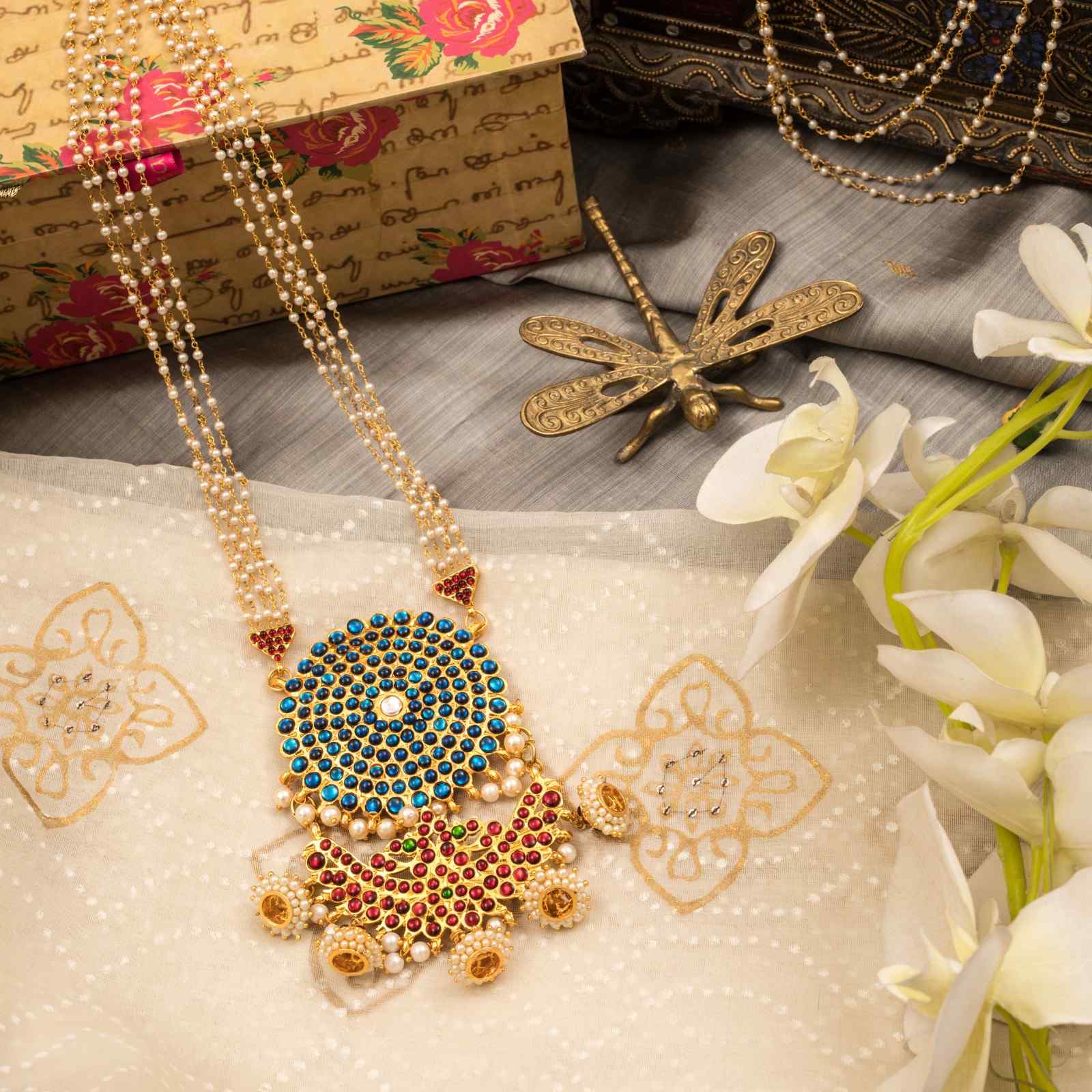 Usher in spring vibes with this gorgeous floral pearl necklace, adorned with delicate pearls. Pair it with matching earwear from the collection to add the perfect ethnic glam to your ensemble. Handcrafted, each piece may feature slight variations.
