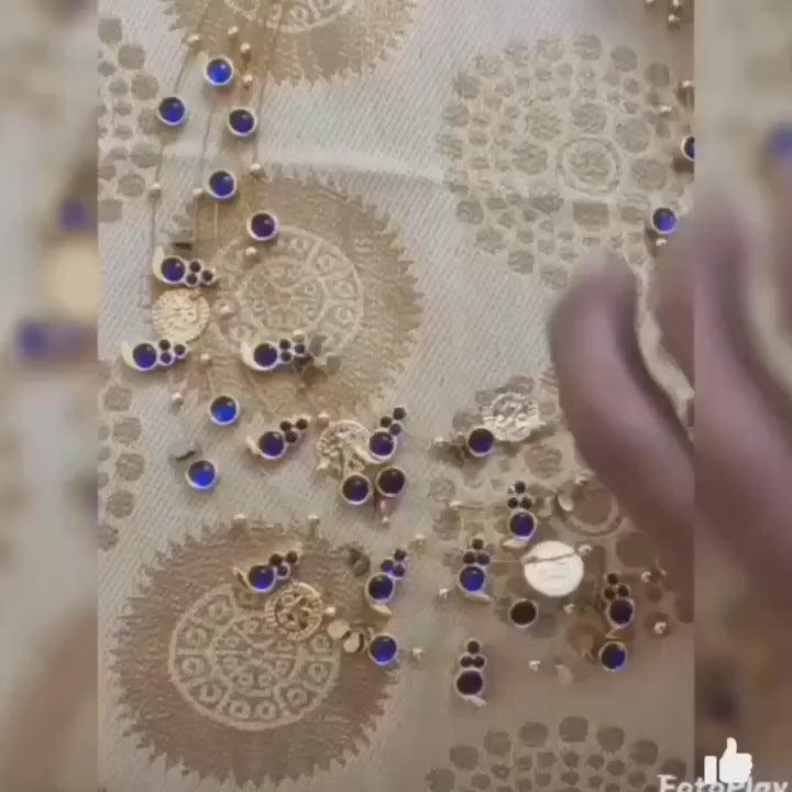 Brass and copper metal motifs with red and green synthetic kemp stones and Synthetic pearls.