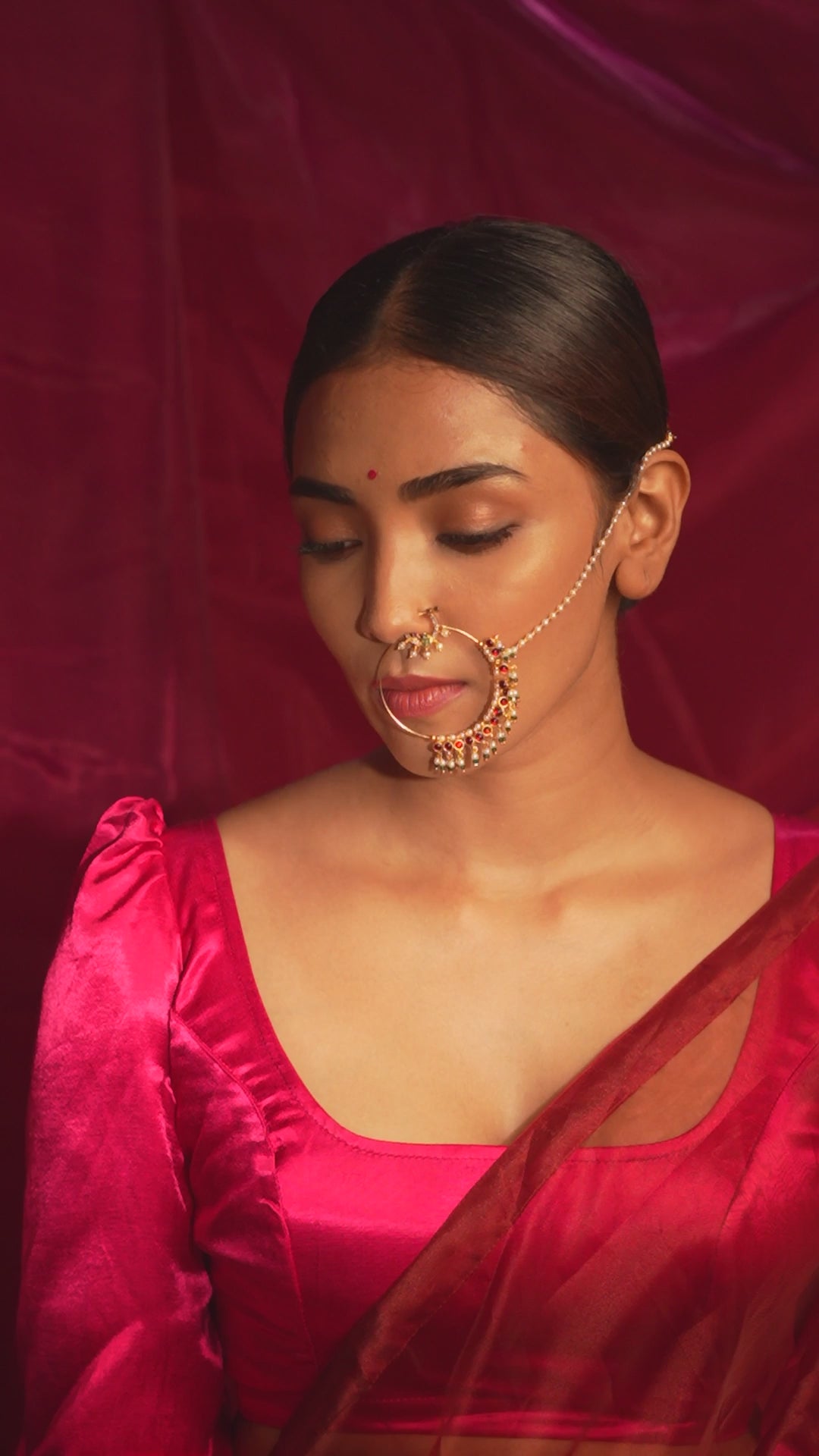 This temple nath is a stunning fusion of Mughal and South Indian temple jewelry, adding a unique twist to your wedding look. Perfect for complementing a madisaar, it effortlessly elevates your ensemble. Handcrafted, so small variations may occur