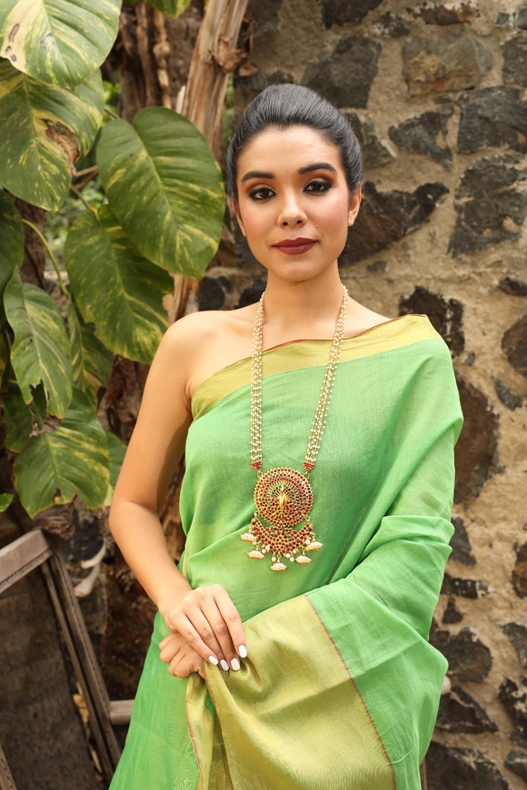 As proud as a peacock, this pearl necklace will make heads turn with its beauty. Styling Tip: Pair it with any ethnic outfit, elaborate or simple, and add a fresh twist to your wardrobe. Each handcrafted piece may vary slightly, adding uniqueness