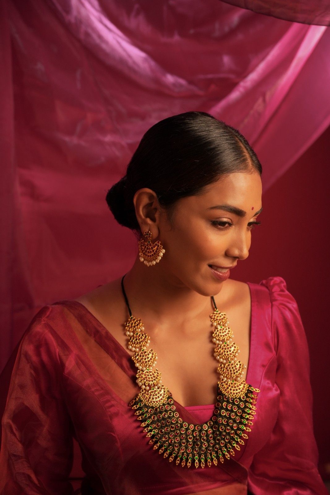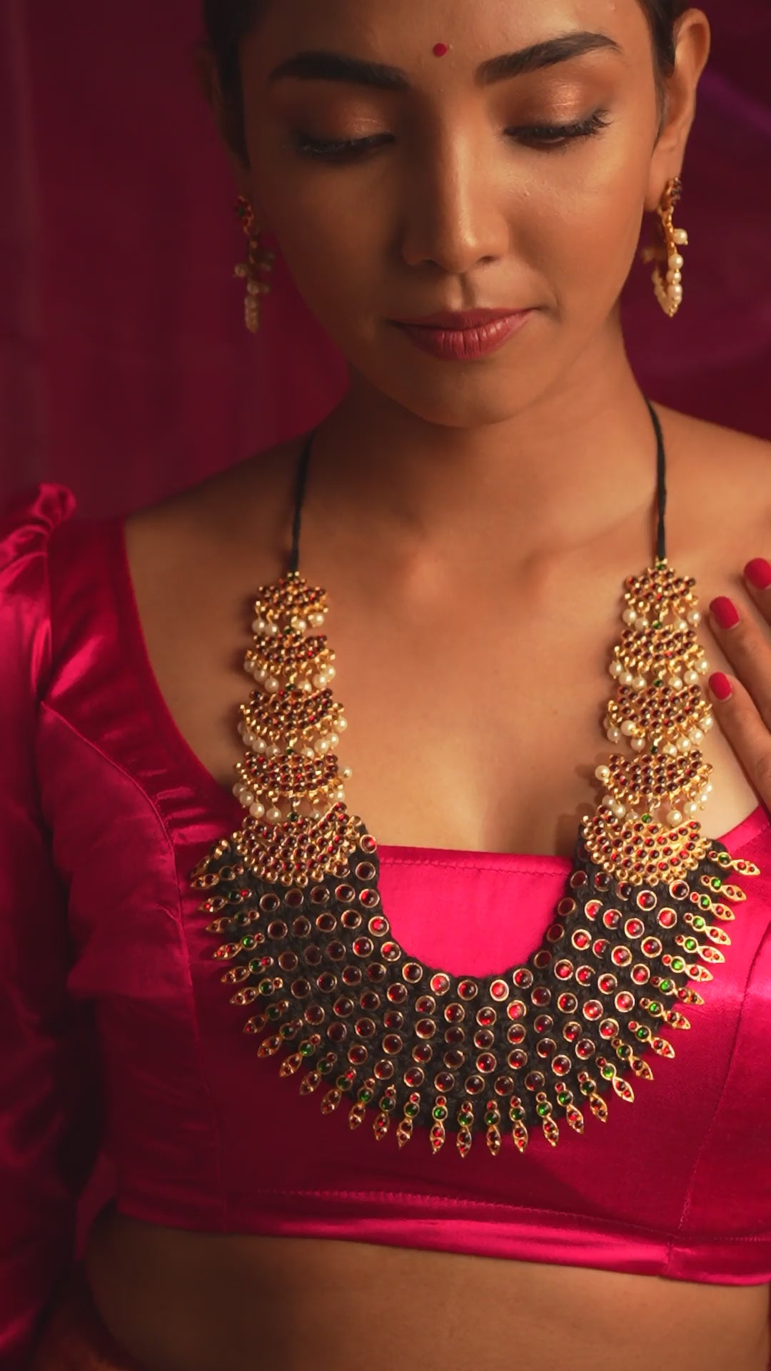 Brass and Copper metal, plated temple motifs, Synthetic kemp Stones and pearls , Jute and Cotton Cords
