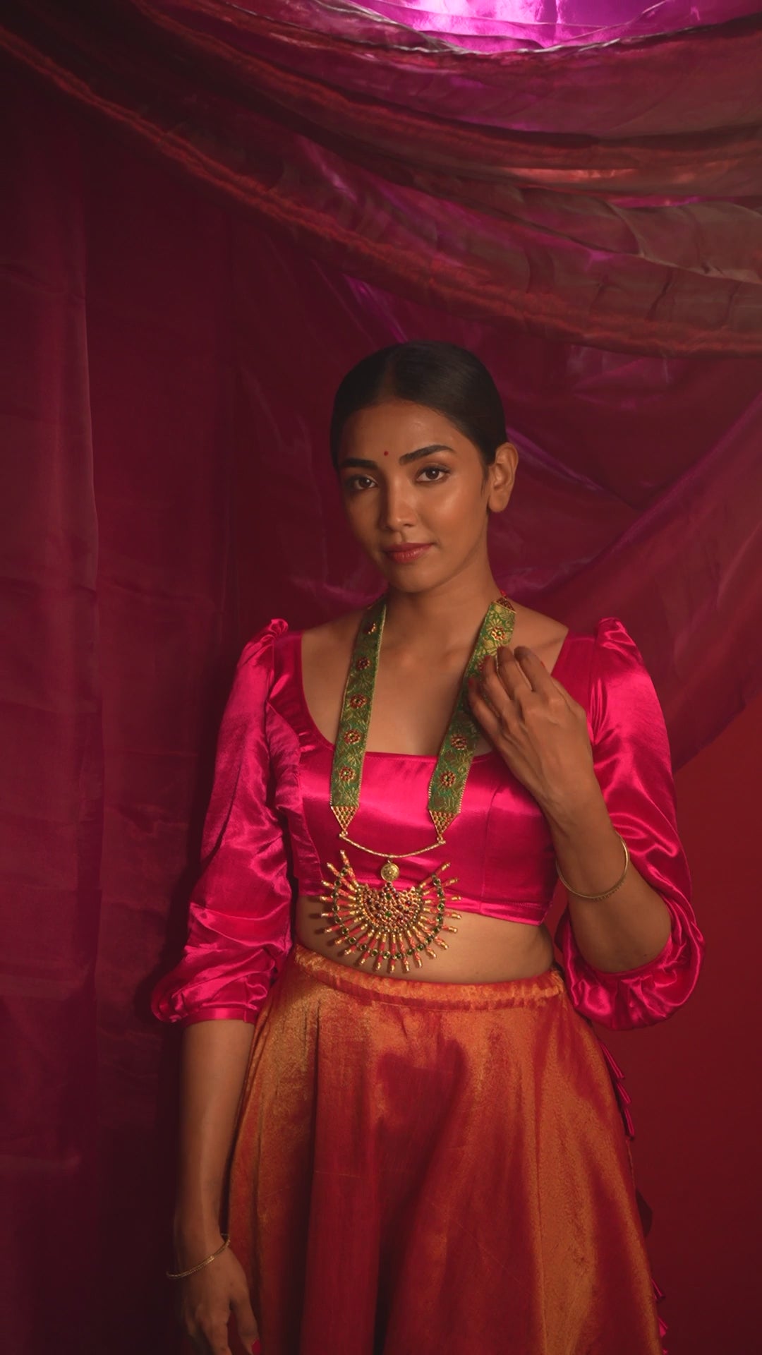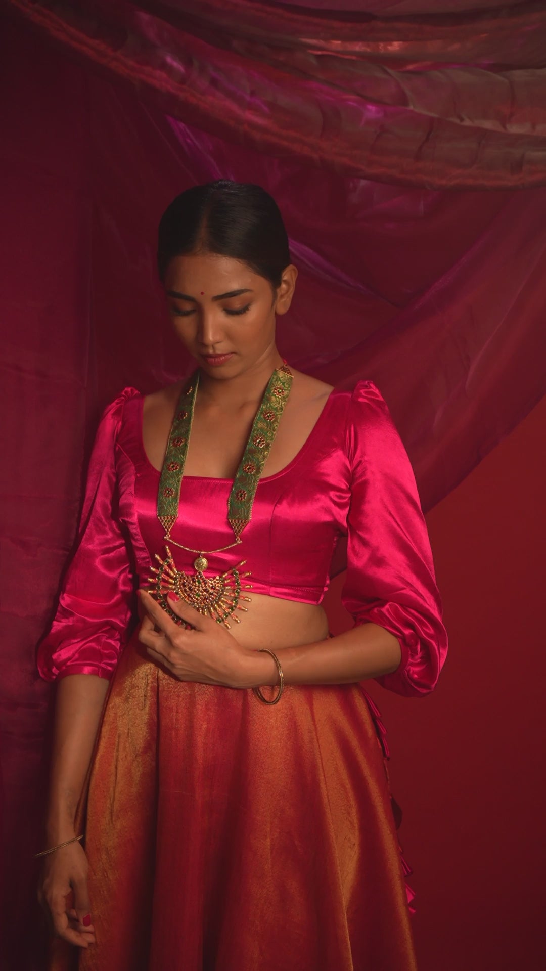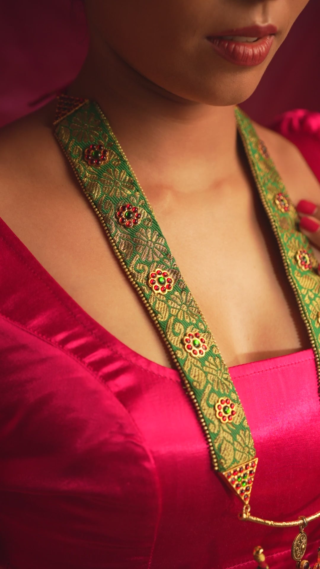 A conversation starter, this wedding haar combines banarasi brocade with temple motifs, making it a true showstopper. Its classic fusion is sure to turn heads on your special day. Since each jewel is handcrafted, small variations may occur from piece to piece