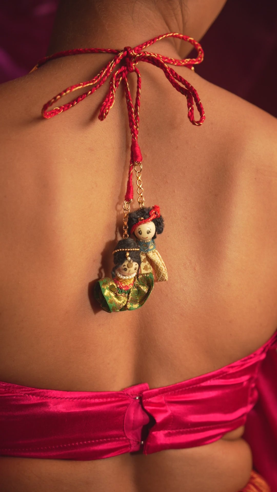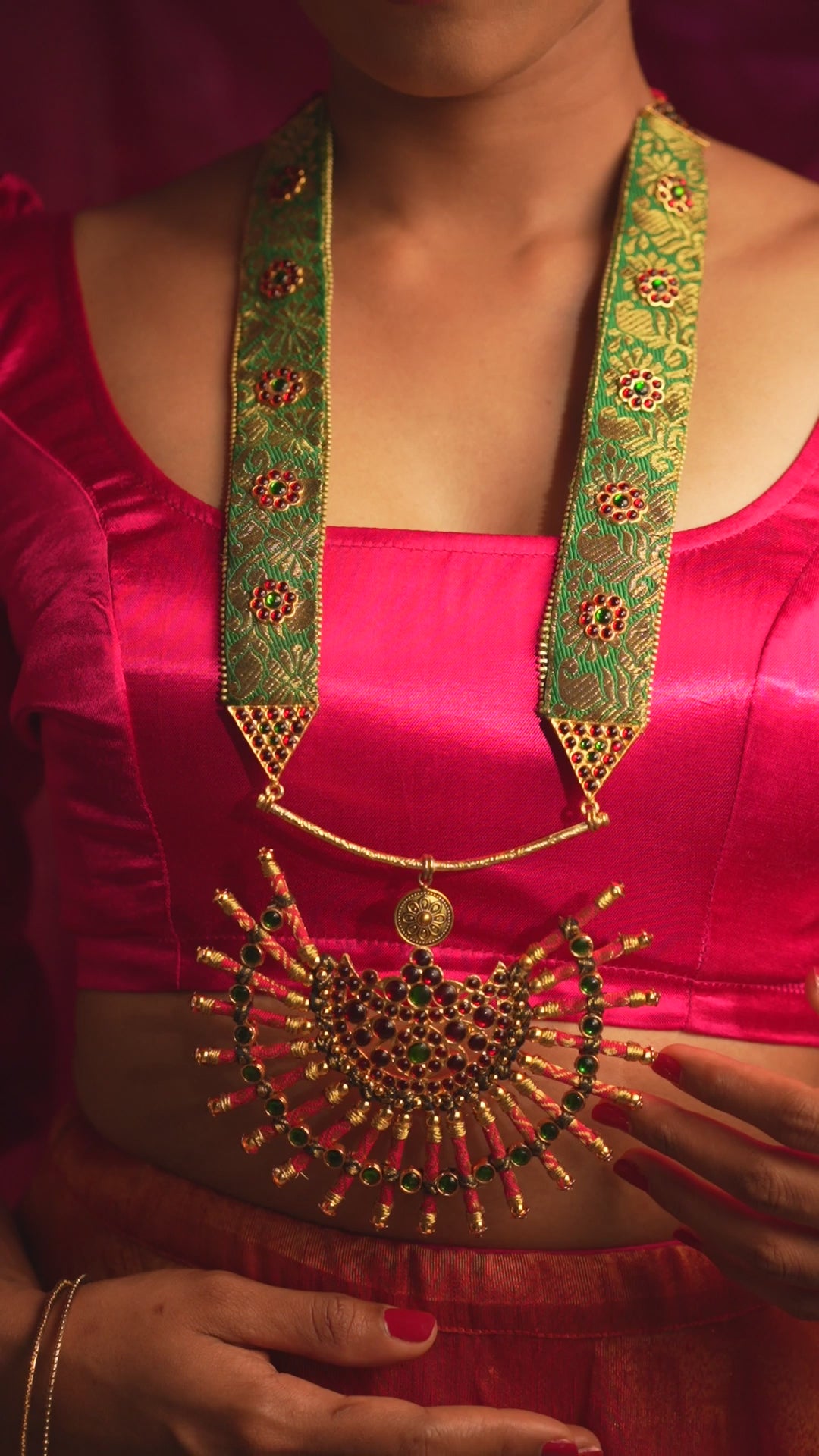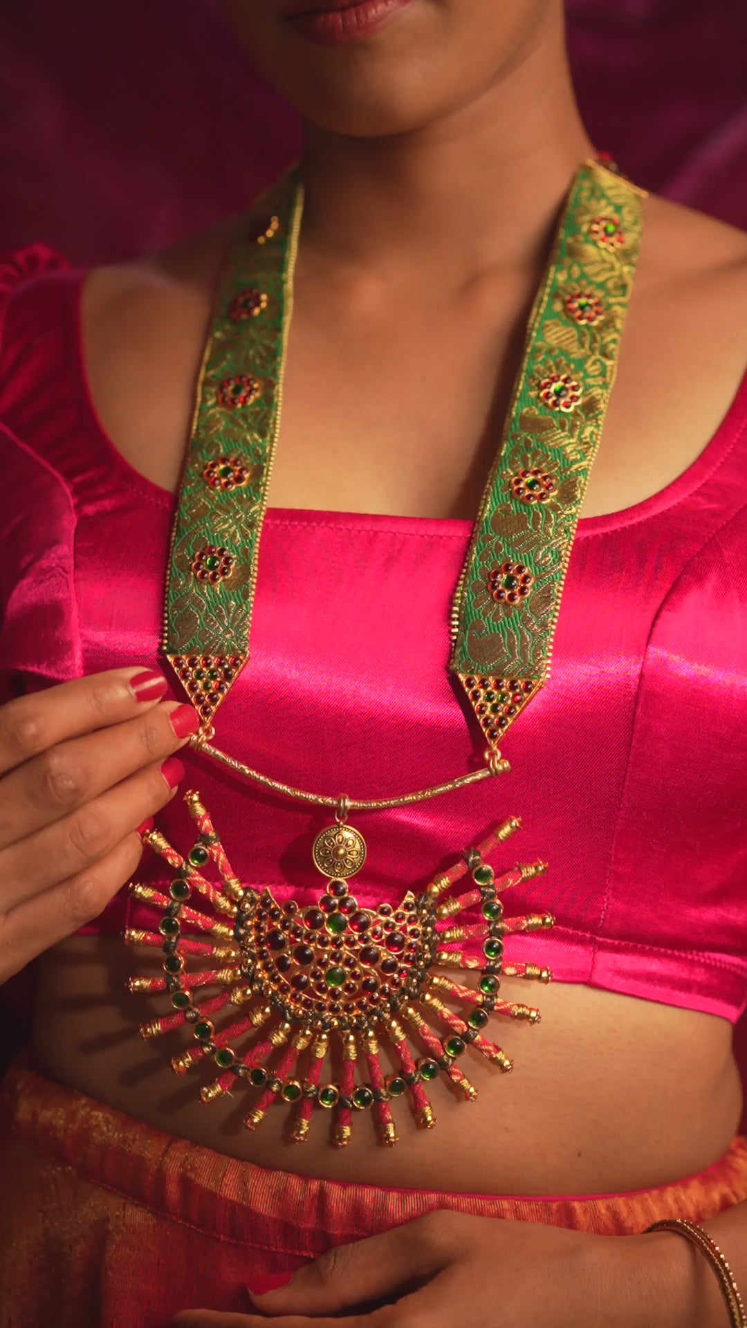 Brass and Copper metal, plated temple motifs, Synthetic Stones and beads, Cotton Cords and zari fabric