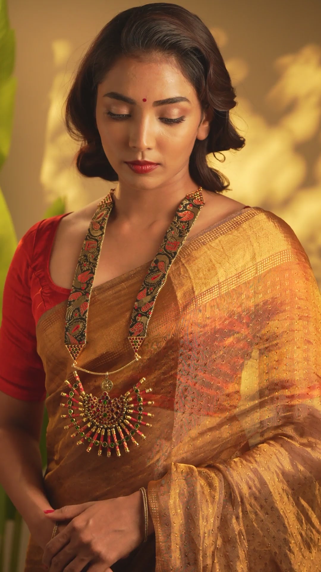 A conversation starter, this temple haar design is a showstopper in our collection. The fusion of banarasi brocade and temple motifs is sure to turn heads. Since each jewel is handcrafted, small variations may occur from piece to piece