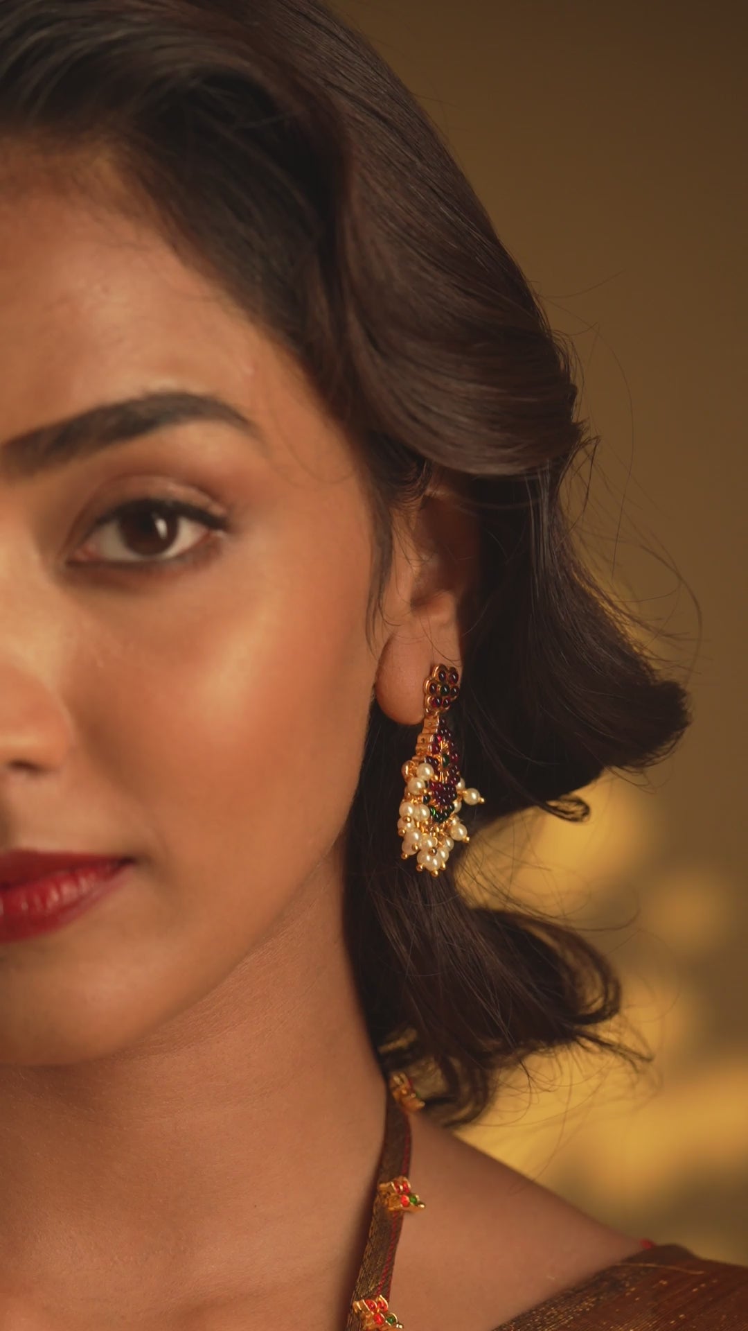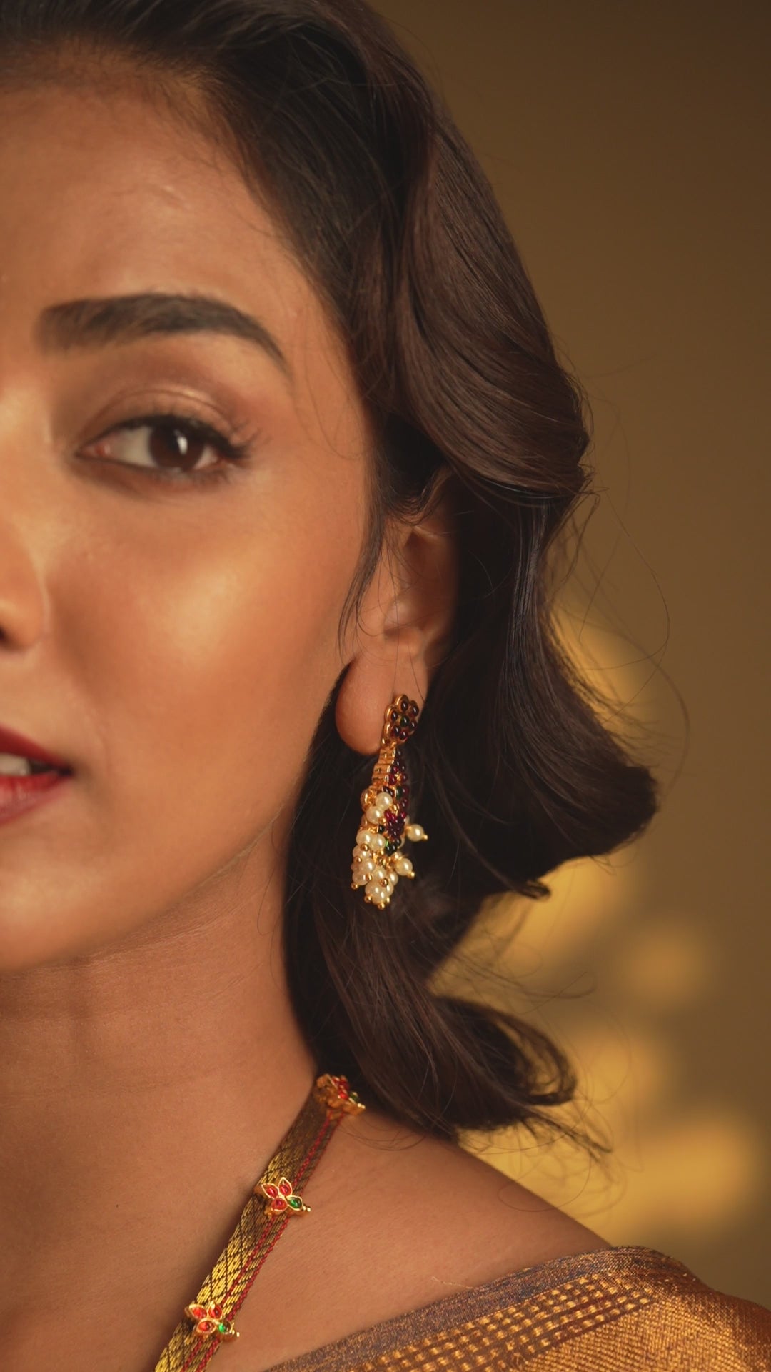 Add a touch of tradition to your look with this temple jewellery necklace set, a perfect fusion of banarasi brocade and temple motifs. A festive must-have, instantly enhancing your ethnic ensemble. Each piece is handcrafted, so small variations may occur