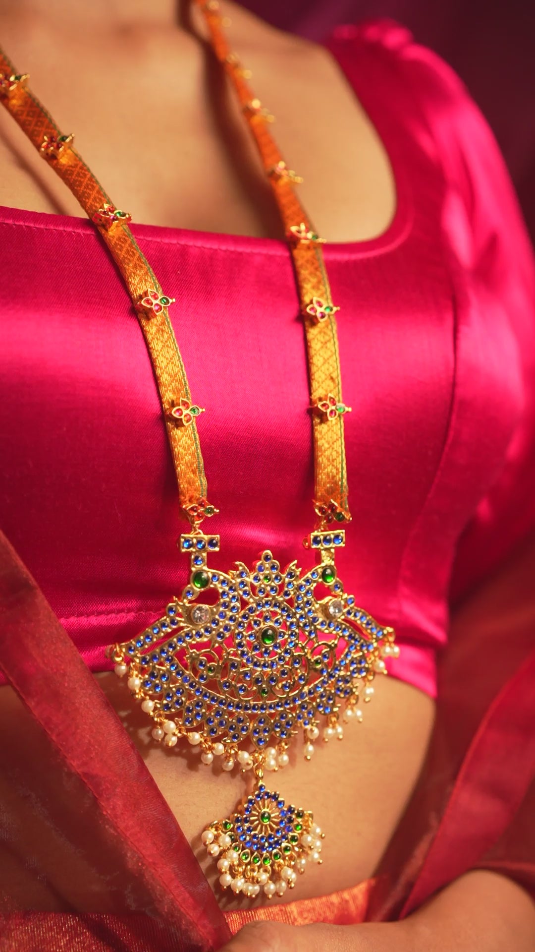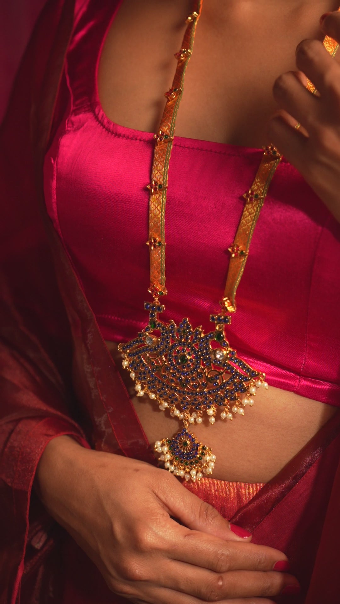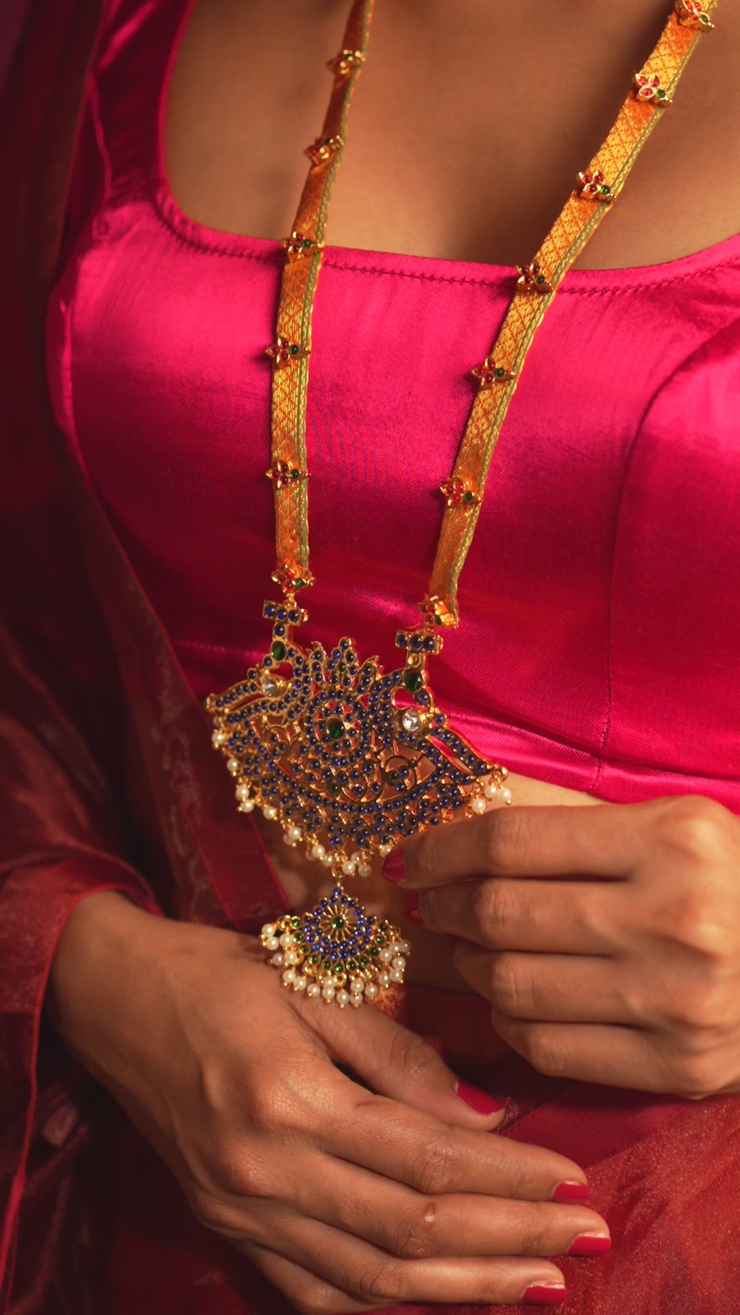 This long necklaces for women, blending banarasi brocade and temple motifs, adds the perfect touch of elegance to any ethnic look. A festive must-have, handcrafted with care, ensuring each piece is unique