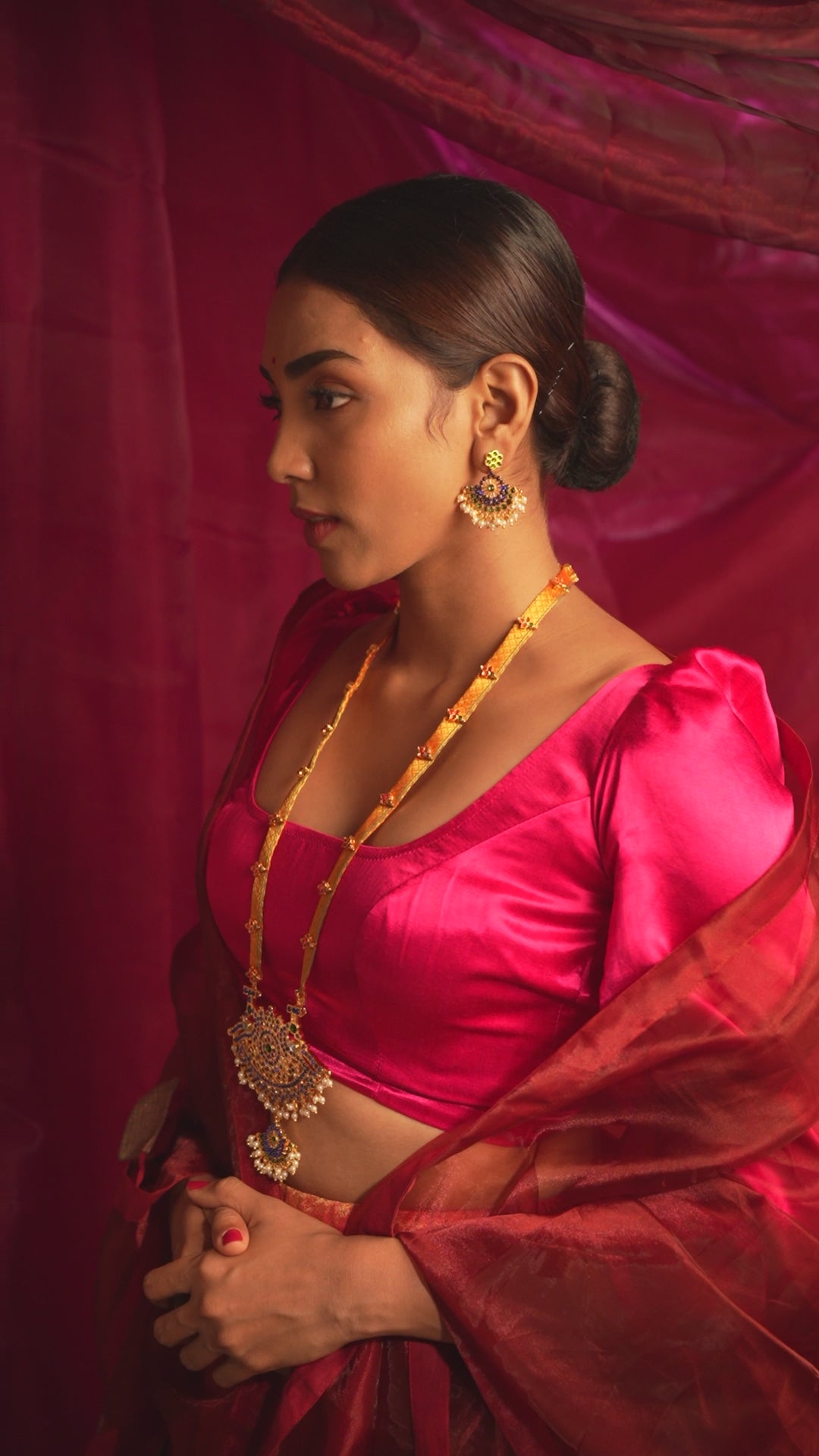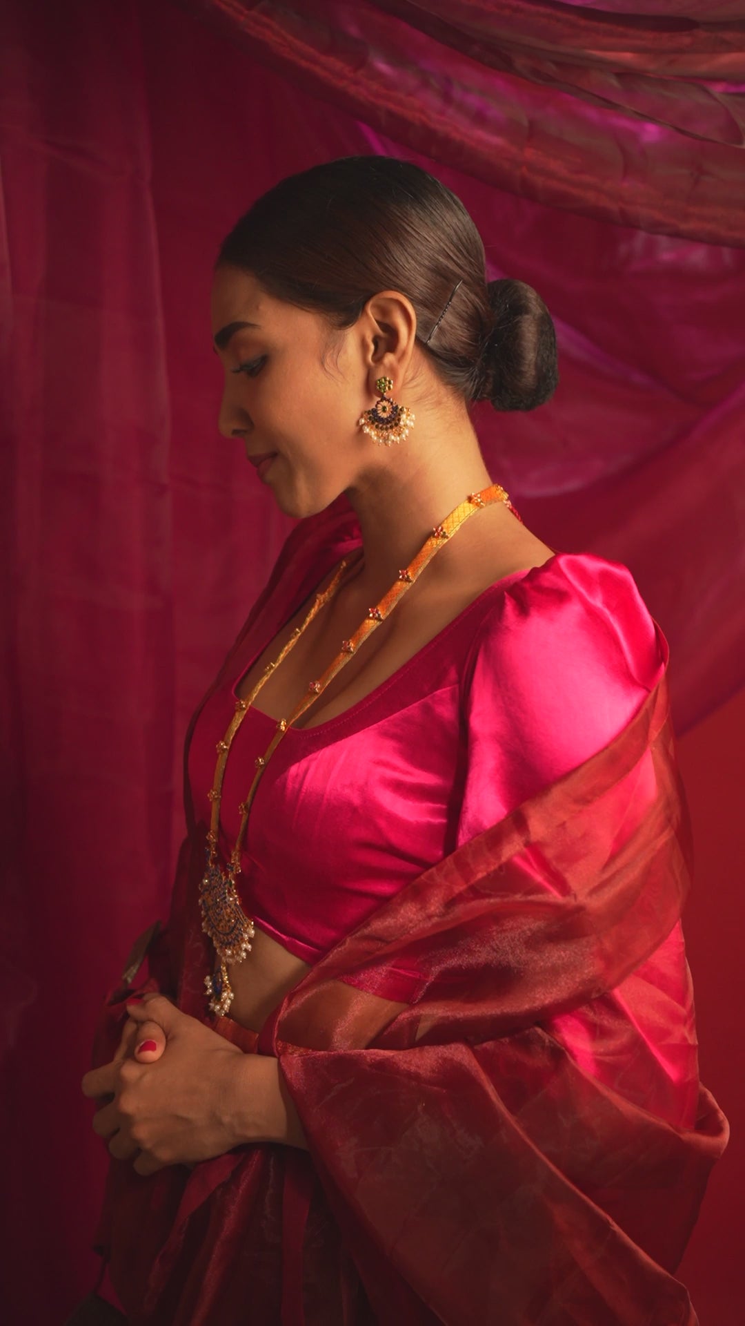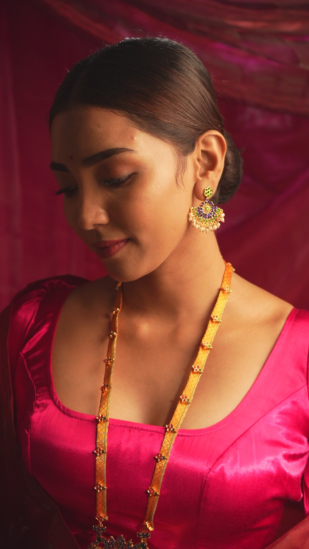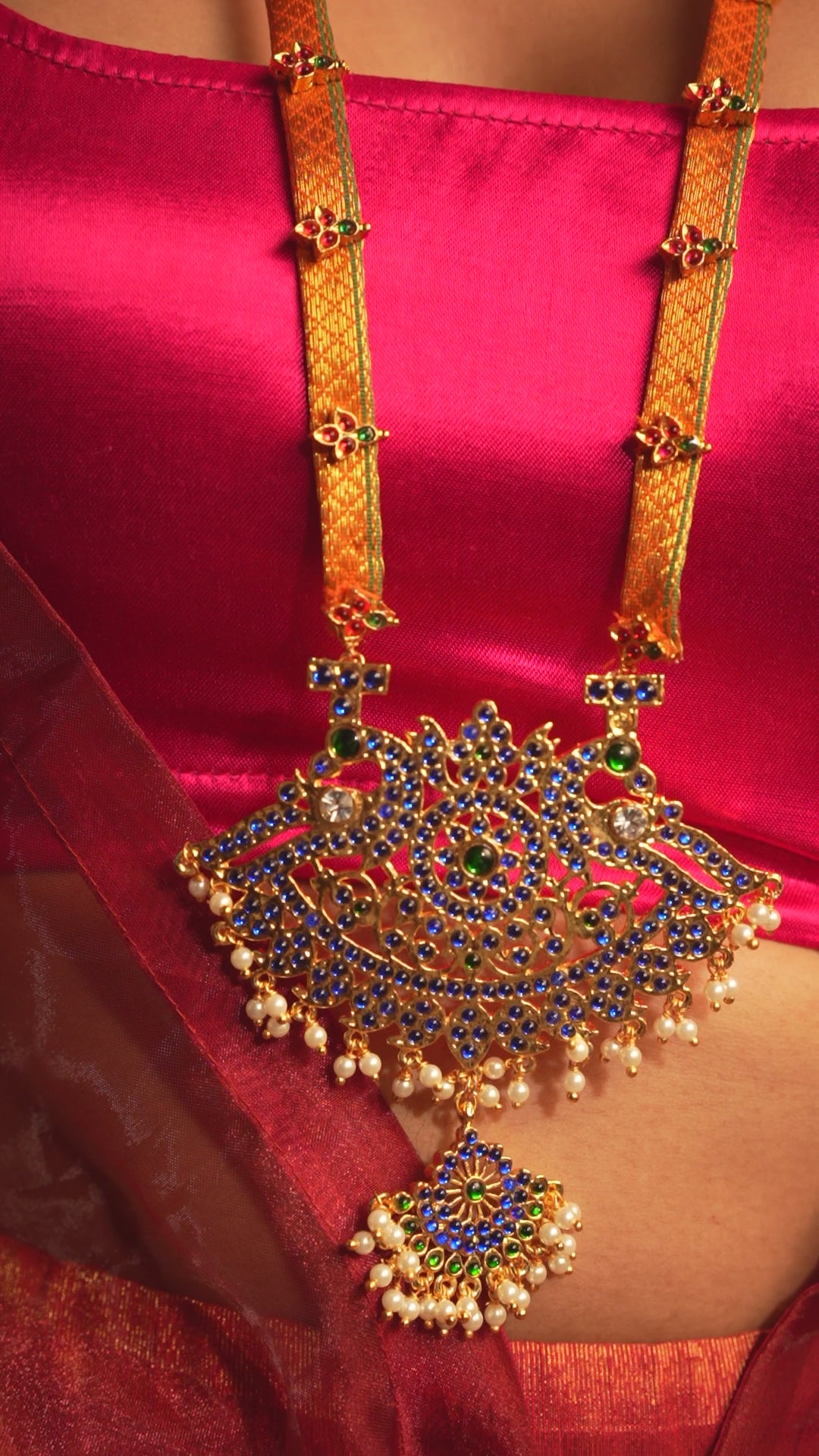 This long necklaces for women, blending banarasi brocade and temple motifs, adds the perfect touch of elegance to any ethnic look. A festive must-have, handcrafted with care, ensuring each piece is unique