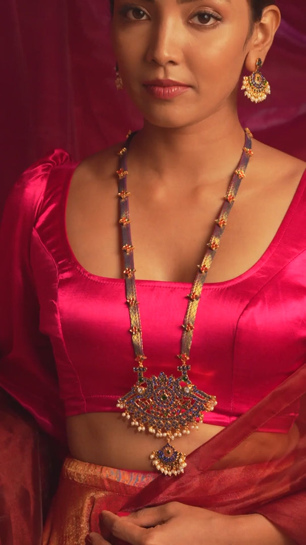 This long necklaces, a stunning fusion of banarasi brocade and temple motifs, is the perfect festive accessory. Add a touch of charm to your ethnic look instantly. Each piece is handcrafted, so slight variations may occur