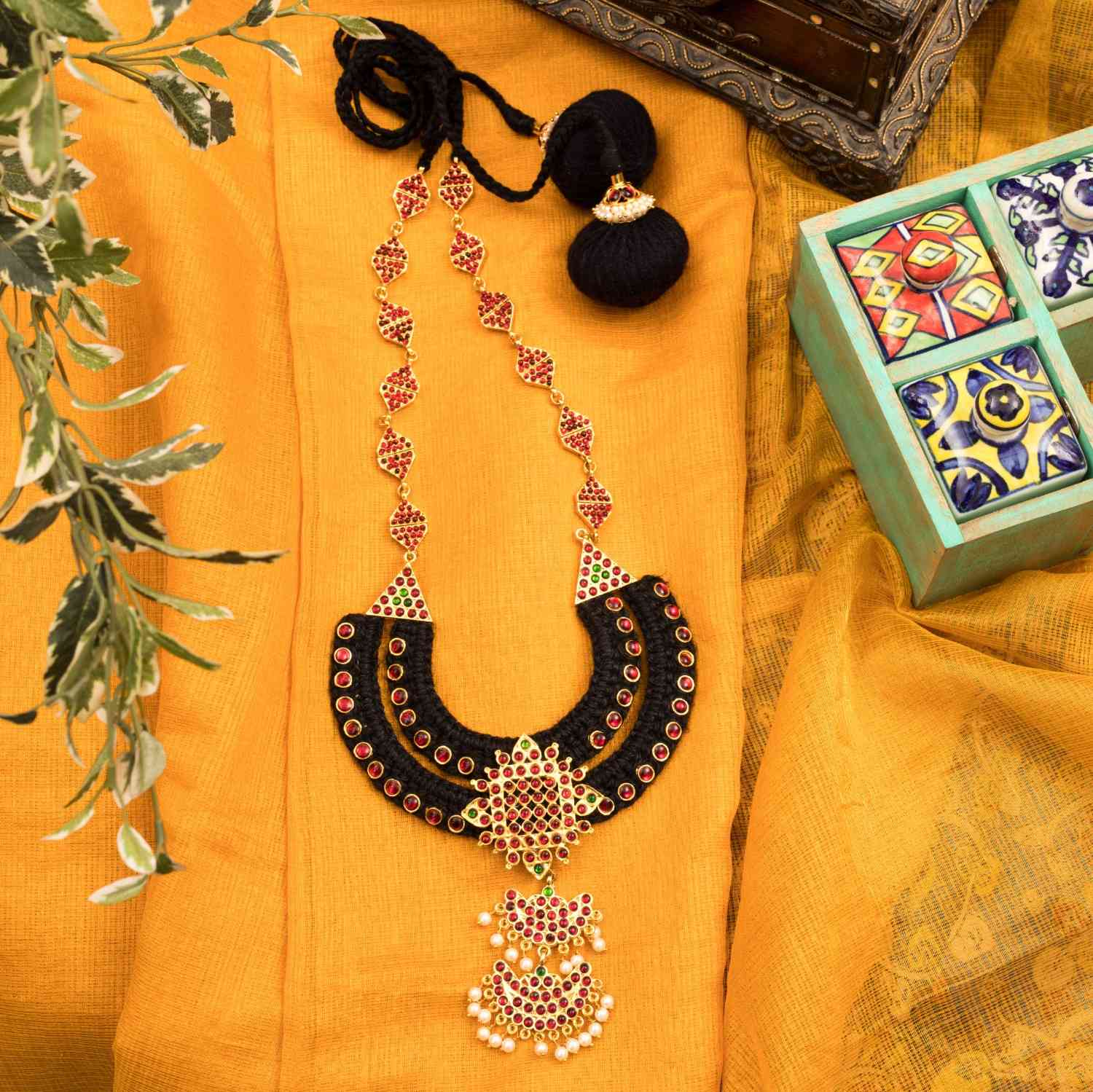 Cotton chord, brass and copper motifs and red and green synthetic stones and synthetic pearlsa and cotton chords